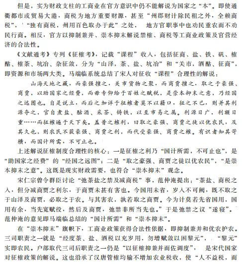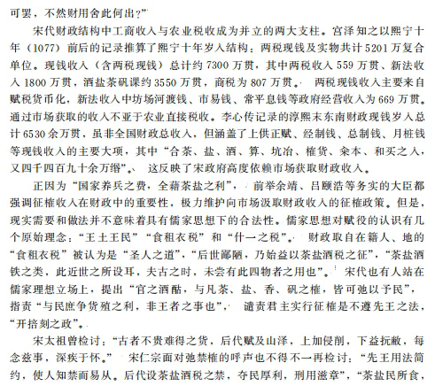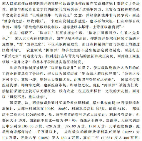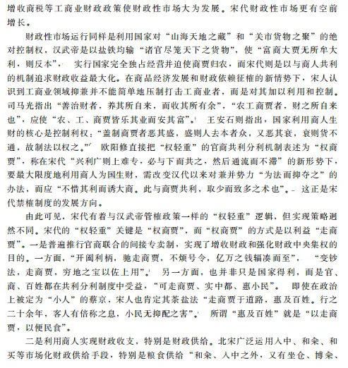 宋代仍在“王土王民”原理,以及“崇本抑末”“抑兼并”“权轻重”的逻辑下坚持传统农商观念,解说工商业政策的合法性,从而使工商业收入得以“合法”增长。在这一原理和逻辑下,皇帝对山海资源和“四民”轻重有绝对支配权,有权在财政收益最大化目标下安排市场商品结构,将几乎所有具有广域流通性、农业不能自给的重要商品实行官营禁榷,财政收支广泛使用市场化手段,造就了规模空前的财政性市场,并在商品结构和远距离贸易中相对于自发性市场占据了主导地位。