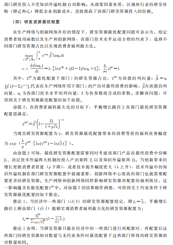 需要指出的是,本文在创新网络的形成机理、研发资源的部门间配置、创新政策的作用机制三个方面有待完善,可以作为未来进一步研究的方向。首先,假设创新网络是外生给定的,没有将创新网络内生化,后续研究可以深入研究创新网络的形成机理,分析影响创新网络形成的重要因素,如人力资本流动、企业异地投资等。其次,研发资源配置分析仅涵盖私人部门,没有考虑公共部门的作用。高校等公共部门是国家创新体系的重要组成部分,在模型中引入公共部门,可以更加全面地分析公共部门和私人部门之间的研发资源配置问题,考察基础研究投入对经济发展的作用机理。最后,仅从宏观层面评估创新政策对研发资源配置的作用,没有深入分析其微观作用机制,后续研究可以从微观层面探讨创新政策影响企业创新行为的具体机制,揭示创新政策从微观到宏观的传导路径。