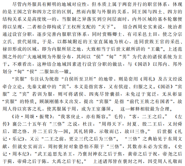 服制是先秦重要的政治制度,也是考察商周国家形态、社会结构诸层面须面对的关键问题。所谓“服”,本义为服从、服事,引申指统治者分派各级贵族承担职事及相应的义务,亦即职贡。一旦职贡的划分通过地域对应性体现出来,便奠定了服制的基础。众所周知,殷商西周时期已经形成较为完备的内外服制,内服和外服之分,不仅反映出王朝地方管理体制的差异性,同时也是统治者实践政治地理构想的产物。文献关于畿服的记载,按服数不同尚有“三服”“五服”“六服”和“九服”之别,甚为复杂,但影响深远者莫过于“五服”和“九服”。鉴于夏商周三代的特殊历史地位,经典文本中的畿服长期被视作政治典范,这种由中心到四方递变的圈层结构,成为古代国家理想的空间秩序,备受后世推崇乃至效法。
