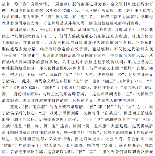 随着新史料的发掘与研究视域的扩展,先秦畿服的研究已取得诸多推进,但不可否认的是,既有成果往往偏重于制度的“证实”或“辨伪”,对不同服制的关系及其转型过程的考察相对有限,言人人殊的局面亦有待改观。问题的肯綮,显然在于通过“循名责实”澄清有关素材的年代层次和使用逻辑。有鉴于此,本文拟从史料溯源、制度考实和廓清流变三个层面展开研究。首先,对《国语》《禹贡》“五服”和《周礼》“九服”各服的内涵与属性加以缕析,分别追溯其史实来源或现实依据。其次,在此基础上,紧扣政治实践与制度设计的界限,考察服制规划的基本思维,同时关注其间隐含的文本加工痕迹。最后,重新审视三种服制的关系,厘清彼此之异同及其产生的时代背景。总之,通过考察先秦服制源流与相关学说的演进脉络,不仅可以从史实层面复原商周国家形态的面貌,亦有助于理解畿服在后世经历重构与复现的思想基础,从而揭示这种宏观政治地理模式在长时段背景下的历史意义。