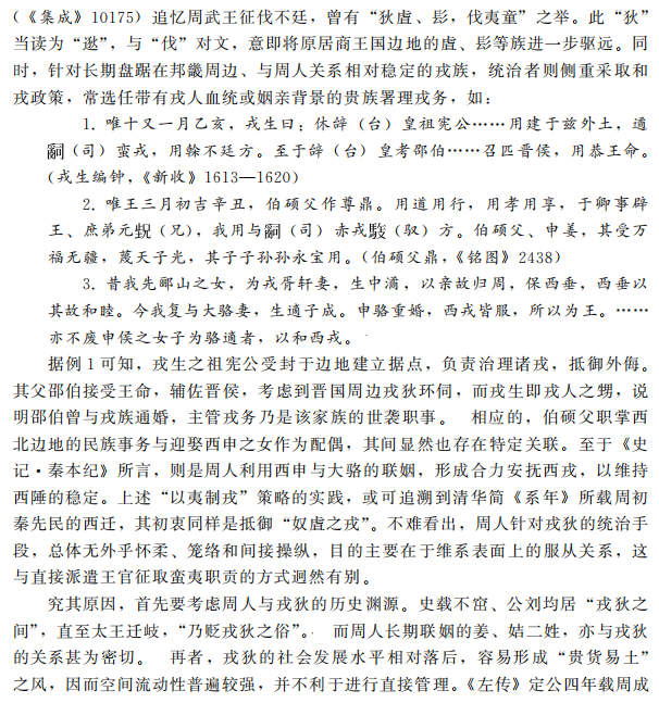 相较于《禹贡》“五服”的典型圈层,上述西周政治地理结构具有两个显著特征。第一,作为王朝核心的都城和“甸服”,并非位于平面的几何中心,而是偏向西端,整体呈现东西不对称的景象。究其根源,主要因为周人本系西土“蕞尔小邦”,历经克商、平定“三监”之乱和征东夷等一系列军事行动,其势力范围渐次向东扩展;相应的,周王无论是分封诸侯,抑或褒封先代苗裔、笼络故旧势力,针对的目标多在东南方向,族群与政治势力重组的主要场景也位于王朝东部地区。这一空间布局,不仅受到周人历史与文化传统的深刻影响,同时也是立国后建立藩屏、防御东方敌对势力的现实需要,可以视作“夷夏东西”对立格局在有周一代的延续。第二,除了“甸服”与外部是以周邦为限,大致可以勾廓四至,其余诸服之间基本没有明确而完整的空间界限。正如戎生编钟(《新收》1614)称皇祖宪公受封“外土”,职掌戎务,父考邵伯辅佐晋侯,可见晋与诸戎都处在周邦“外土”范围。如是,不仅“侯服”和“宾服”可以并存于同一地理层次,“要服”与“荒服”也未被严格限定在最外侧圈层,其分布地域到王朝核心区的空间距离甚至不排除近于部分“侯服”,从而加剧了整个结构的不平衡性。