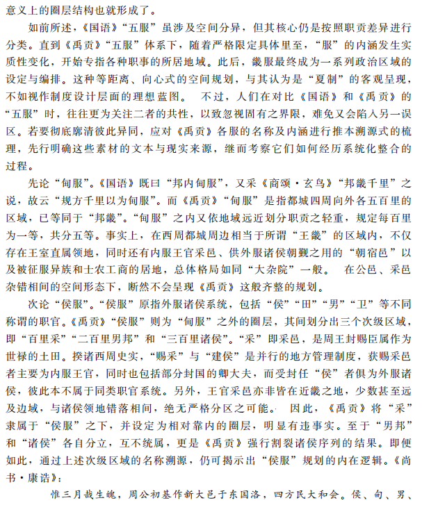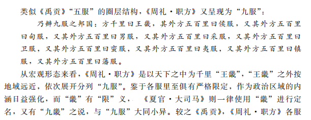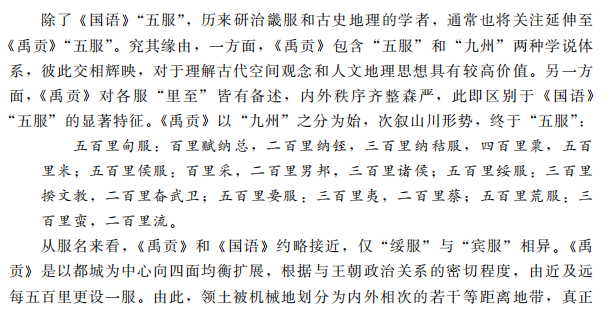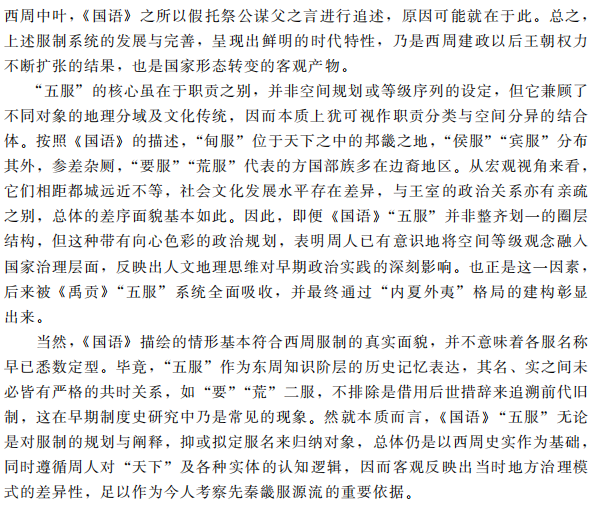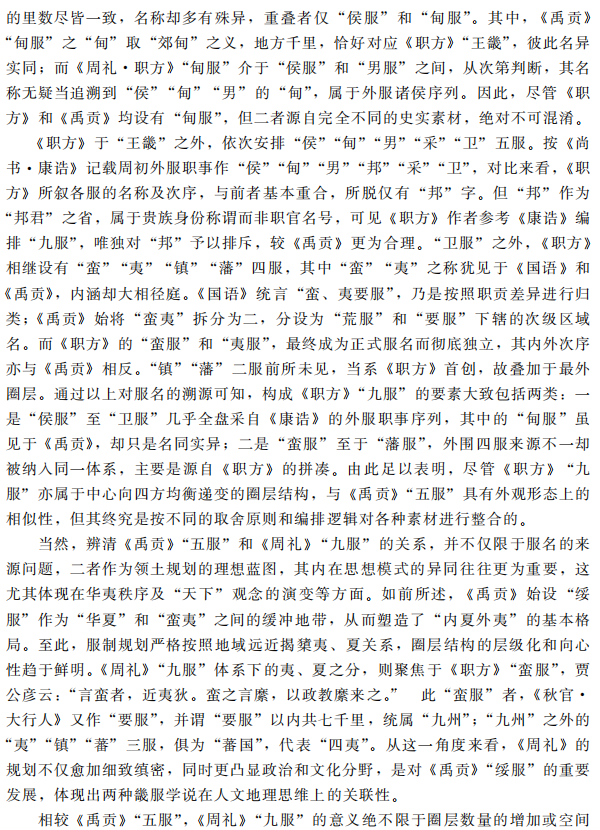 摘 要:畿服之“服”,本义为服事,引申有职贡之义,后演变为政治区域的名称。《国语》“五服”是在商周内外服格局的基础上,逐次增益史实而扩充形成的服制系统,划分各服的依据是以职贡分类为主而兼顾空间分异,其中反映出西周政治地理结构具有不平衡性,对王朝兴衰产生重要影响。《禹贡》“五服”和《周礼》“九服”的文本与现实素材并不一致,对各服的层次安排也体现出相异的史实基础和人文地理思维。二者均为典型的圈层结构,呈现的均衡递变特征与“内夏外夷”观念为后世的政治实践提供了文本依据和思想指南。畿服经历从史实升华为理想蓝图又重返现实层面的循环演进,正是中华文明具有突出连续性的客观写照。
