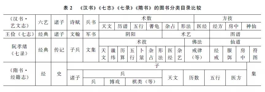 二是艺进入文化中位的“术数”和“方技”之中。隋唐是道教、佛教大盛的时代,在《隋书·经籍志》中,儒家六经被称为“经”,道佛之经也被称为“经”,由“经”代“艺”,这意味着,艺在语言系统中,从文化高位移离出来。移出来到何处去了?进入文化中位的“术数”和“方技”之中。这从《汉书·艺文志》到王俭《七志》、阮孝绪《七录》到《隋书·经籍志》的演进中体现出来,如表2所示。