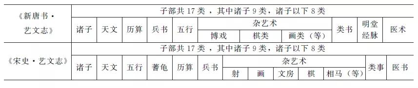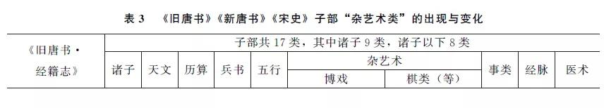 《宋史·艺文志》“杂艺术类”又有新的扩展,体现在三方面:一是在画基础上扩展,新有了与“文房”相关的雅趣,如苏易简《文房四谱》、唐绩《砚图谱》、蔡襄《墨谱》、唐询《砚录》等;二是在棋博游戏基础上的扩展,如赵景《小酒令》、窦譝《饮戏助欢》等;三是对马和驼的知识扩展,如《辨马图》《论驼经》等。这里最为重要的是从画到文房的扩展,使杂艺术的新质扩大。这样在唐宋正史的图书目录所显示的知识分类中,子部分为三个部分:除诸子为一类之外,以前的术数也被分为了两类,在原来一体的术数—方技中,产生了“杂艺术”的新类。且将三部正史中的子部知识体系列为表3所示。