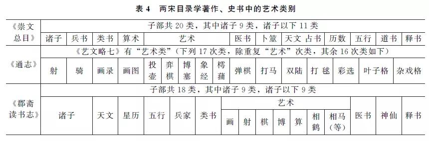 玩之艺的存在,主要体现在宋代的目录学著作中。官方在撰写正史经籍志—艺文志时,盖因有艺术传—方技传作为对照,把玩之艺定义为“杂艺术”。目录学著作中从宋代早期的官修图书目录《崇文总目》始,正史中“杂艺术”的“杂”字就被去掉。虽然“杂艺术”一词并未因“艺术”一词的新用而消失,而是一直还在用,直到清代,钱谦益《绛云楼书目》仍标“杂艺类”,钱大昕补著《元史·艺文志》亦标“杂艺术”。但在宋代,这一脱掉了“杂”的限定语的“艺术”,成为代表新风尚的专词。它在内容上与方术(方技)有本质不同。这一新型“艺术”在两宋的无论官修还是私著的著录中,都占据主要地位。这可从宋代目录学著作和史书《崇文总目》、郑樵《通志》、晁公武《郡斋读书志》中呈现,如表4所示。