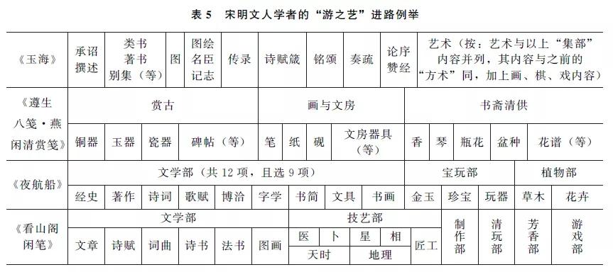 《玉海》把艺术放进“集部”之中,作为“文”下面的一类,看重的是艺术与文学在趣上的共通性,虽然《玉海》的“艺术”观念,除了画、棋、博戏等,还包括方术内容,这些虽也与庭院之趣有相通一面,但关联性不大。最重要的是,把以画、棋、博戏为代表的艺术与文学共类,乃庭院中玩之艺的实情。《遵生八笺·燕闲清赏笺》把庭院之趣,作了最全面的扩展,书法、琴、文玩、香、花、瓶插、盆景等,都包括进来,只有诗文未进。但在古代,诗文是与政治、文化、社会实用相关的,可以不包括。而与琴棋书画的闲趣相同的诗文可包括进来,是不言而喻的。此处不包括是欲与实用诗文相区别而已。在《夜航船》中,庭院的玩之艺被分为三个部分,文学部、宝玩部、植物部。这里包括与《遵生八笺·燕闲清赏笺》大致相同的范围,但最大的一点区别是文学在庭院之趣中的地位,而且此处把书和画都归在文学部。《看山阁闲笔》也按从《玉海》到《夜航船》的传统,把书画归到文学部,既与医、卜、星、相、匠的技艺部区别,也与制作、清玩、芳香、游戏的玩之艺的艺术区别开来。在黄图珌的书中,已出现清代艺术的新内容,此点放到下节再论。