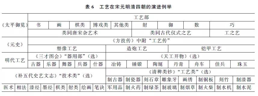 从表6中可见,《太平御览》中“工艺部”列“巧”,《元史·方技传》中附有《工艺传》,记录7人:雕塑工艺2人,铠甲工艺2人,造炮工艺3人,三分之二都与军事工艺相关。正是在这一关注工艺的发展过程中,明代的王圻、王思义编纂的《三才图会》呈现了古器、乐器、舞器、兵器、什器(居室及文房相关之器)等各类的工之艺。明代宋应星的《天工开物》把工之艺从珠宝、陶埏、丹青等扩大到舟车、冶铸、锤锻等行业领域。对工之艺的重视影响了“艺”的语用方式,宋代沈括《梦溪笔谈》、明代沈德符《万历野获编》中都列了“技艺”类,与“工艺”一样,更强调技术性一面。清人顾櫰三《补五代史艺文志》中,把历代艺文志子部中的“艺术类”,改为“技术类”,也因受历史潮流的影响。最后民国初年徐珂编撰《清稗类钞》,“工艺部”中把玩之艺中的文玩、瓷器、画绣等放了进去,也把各种工业工艺,如水泥、火柴、烟草以及军事的火药、军械的工艺,囊括其中。