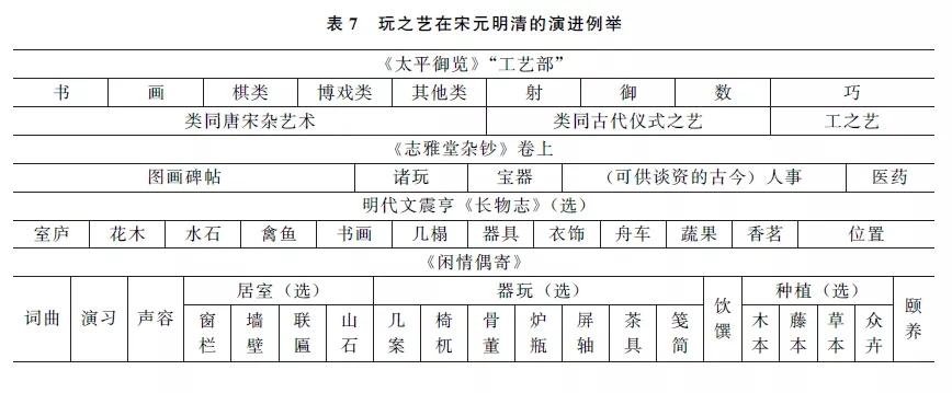 宋元明清四朝,工艺在内容和名称上有所演进。较为重要的是工之艺与玩之艺在居室中器物的交迭(如《长物志》中的室内家具和器物系列)。这又在于,生产行业的工之艺与庭院休闲的玩之艺,在艺上有共性,就是前面《考工记》四要点内蕴的中国器物的虚实结构以及与宇宙观虚实结构的关系。正是这一关系,使中国工之艺的实际运行,与中国之艺的总体性质和体系,紧密相关且与之共进。如黄大成《髹饰录》讲:“凡工人之作为器物,犹天地之造化。……利器如四时,美材如五行。四时行,五行全,而百物生焉。四善合,五采备,而工巧成焉。”又如丁佩《绣谱》讲绣工的择地、选样、取材、辨色、论品等,“绣近于文,可以文品之高下衡之;绣近于画,可以画理之深浅评之。周规折矩,斐然成章,谓之能可也;惨淡经营,匠心独运,谓之巧可也。丰韵天成,机神流动,斯谓之妙;变幻无穷,殆非人力,乃谓之神。”张岱《陶庵梦忆》讲,竹、铜、土作为材料各地皆有,而“嘉兴之腊竹,王二之漆竹……张铜之铜,徽州吴明官之窑”的工艺之妙,使这些领域的技工可“与缙绅先生列坐抗礼”,正在于达到了《庄子》中郢人运斤和庖丁解牛的高超之艺。行业的工之艺与庭院的玩之艺内在相通,二者在器物上相互交迭。工之艺的扩展,渗进玩之艺,玩之艺的扩展,渗进工之艺。表6是从工艺的角度,呈现了工之艺在自身演进的同时就是向玩之艺的扩展。同样,从玩之艺的角度,也会呈现自身扩展的同时向工之艺扩展,如表7所示: