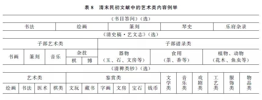 从宋代早期《太平御览》“工艺部”中与《宋史·艺文志》“杂艺术”相对应的部分,到宋末周密《志雅堂杂钞》、明代文震亨《长物志》、清代李渔《闲情偶寄》,玩之艺明显地从画、书中心向居室、器物、茶、香、花木等方向长足发展。用文震亨的话来讲,成为与功利性质无关的审美“长物”;用李渔的话来讲,成为与功利之心无关的审美“闲情”。然而当与书、画、琴,以及戏曲不同的器,进入玩之艺的系列之中,最重要的,也是最具有中国文化特色的,是使文房和庭院的所有日常器物朝向了一种精致化的审美演进。这种中国文化所特有的美,经过几千年的积淀,从五代两宋词中佳人闺房里的精致器物和文人雅士的文房器物中体现出来,也从宋代名窑汝、官、哥、钧、定的雅致瓷器中体现出来,然后在明清有了一种全面的升华,在《金瓶梅》《红楼梦》的室内器物描写中突显出来。这样,如果把宋以来的玩之艺与工之艺这两个相互交迭的体系并置在一起,一端是书、画、琴这类纯玩之艺,另一端是冶铸、锤锻、烟草、军械等纯生产工艺。中间的香、茶、棋、博、门、窗、几、案、瓶、盆、杯、器等则有档次分层、精粗分质、用赏分类的多种性质,呈现为一种复杂组合体。从不同的角度,可以对之进行不同的分类。且从清末民初的三种具有影响力的著述《书目答问》《清史稿》《清稗类钞》,来考察其分类,如表8所示。