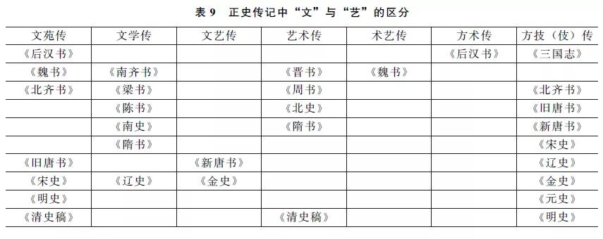 表9中《新唐书》《金史》的“文艺传”与艺术无关,与“文苑”“文学”义同,是文人之传。文人皆为士人,在文化等级上高于艺人。艺人无论是方术型的术士,还是工匠型的匠人,抑或舞台表演的艺人,都低于士人。当书法正在上升到接近文学地位的三国时代,著名书法家韦诞对自己有高超书艺而羞悔,并“因敕儿孙:勿复学书。”当绘画正在向上提升的唐代,著名画家阎立本因自己有高超画艺而懊羞,并诫其子曰:“勿习此末技。”两宋画院,赫赫有名,但与天文、书艺、医官三局并列的翰林图画院,“地位低,待遇差,迁官难,并为士大夫所不齿。”纵观整个古代历史,文与艺是两个完全不同的等级。无论是正史还是个人著述,文学与艺术要被专门分开,虽然在士大夫庭院的玩之艺中,诗、词、文、书、画、茶、香、文玩在生活中已经被一种统一的雅韵统合起来,但在正史、类书、图书目录以及各种著述中,文与艺还是要被专门分开。文主要在集部,艺主要在子部,大类上区别分明。总而言之,艺术要专列在文学之外,被作为一个低于文学的价值等级进行定位。