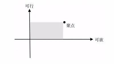 假设一个人有理性智慧,那么,在无限欲望与有限能力之间肯定能够理性地选择一个相对最优的目标,即极限能力下的可及目标。以最简化的模型而言,相当于在一个二元坐标中求解可行值域约束下的可欲项目最大值,或反过来说,在可欲值域里求解可行性的最大值,相当于求解可欲与可行的“聚点”(focal point,参照托马斯·谢林的定义),即求解欲望和理性智慧的交汇点,也就是最优理性解(并非唯一理性解。保守主义者可能选中略低于最优解的其他理性解)。这个聚点可以映射到制度而问题保持不变,即一个可接受并且可信任的制度必须有理性智慧,足以求解可行值域约束下的可欲选项最大值,或可欲值域里的可行选项最大值,两者一致即聚点。如图: