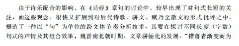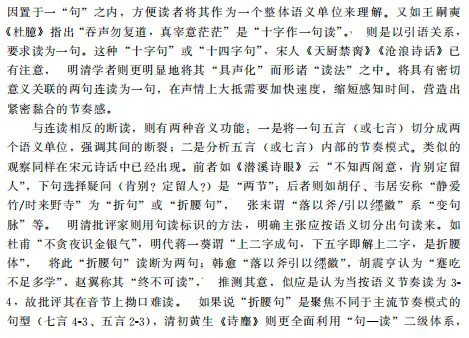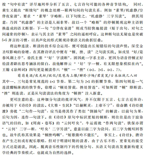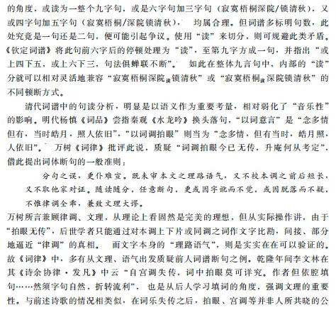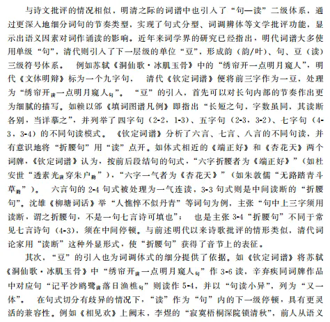 其三,句读节奏美学是一种基于诵读行为的有声艺术实践,虽然也可能受到配乐的影响,但其“音乐性”主要体现为语言本身的韵律属性。诗、词等文体中的句读,大体上呈现出从受制于配乐,到脱离原始音乐语境、聚焦语言本身音义停顿的演变。例如《诗经》早期章句恪守传注,后期评点则尝试不同句读可能,以及词谱早期保留长句,后期划分“豆”断,皆其例也。这种现象反映了文学批评从音乐审美中独立,转而从语言自身探索其节奏模式的发展过程。