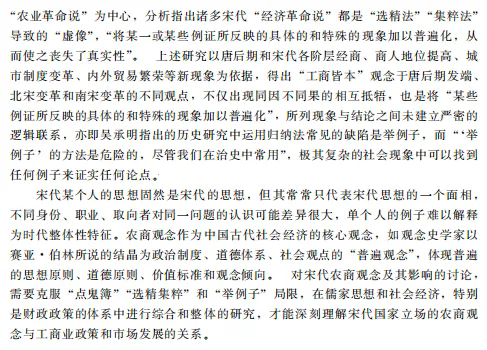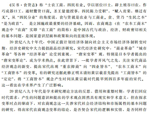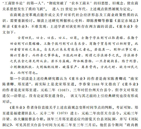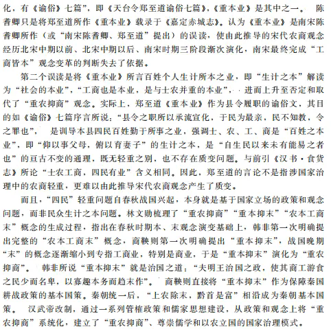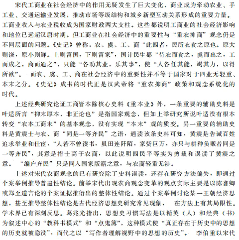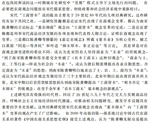 学术界之前普遍认为宋代农商观念发生变革,即从“重农抑商”“农本工商末”转变为“工商皆本”或“四业皆本”的观点是材料误读和方法偏失导致的虚像。宋代作为国家意识层面的农商观念并无质变。该问题的经典研究从个案研究推导普遍性结论在方法上具有局限性。农商观念是关乎对宋代社会经济整体认识的重大问题,理解宋代农商观念及其影响下的宋代财政、市场和经济运行,需要细读史料,对工商业政策和社会经济作综合和整体的考察,揭示观念得以成立的基本原理,以及观念与实践的关系和张力,才能接近宋代历史的实情和逻辑。