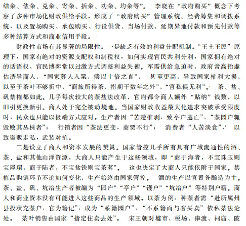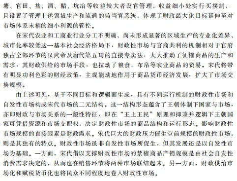 宋代仍在“王土王民”原理,以及“崇本抑末”“抑兼并”“权轻重”的逻辑下坚持传统农商观念,解说工商业政策的合法性,从而使工商业收入得以“合法”增长。在这一原理和逻辑下,皇帝对山海资源和“四民”轻重有绝对支配权,有权在财政收益最大化目标下安排市场商品结构,将几乎所有具有广域流通性、农业不能自给的重要商品实行官营禁榷,财政收支广泛使用市场化手段,造就了规模空前的财政性市场,并在商品结构和远距离贸易中相对于自发性市场占据了主导地位。