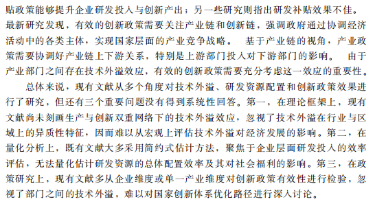 本文通过构建包含生产网络和创新网络的内生增长模型,系统研究中国研发资源配置效率问题,以及创新政策对研发资源配置的优化作用。研究发现,技术创新具有明显的外溢性,有效的创新政策应考虑部门在生产网络和创新网络中的位置。然而,由于企业决策往往忽视技术创新的外溢效应,竞争均衡下的研发资源配置显著偏离社会最优水平。在保持各年研发资源总量不变的情况下,优化研发资源配置能大幅提高社会福利,凸显了识别技术外溢对创新政策设计的关键作用。