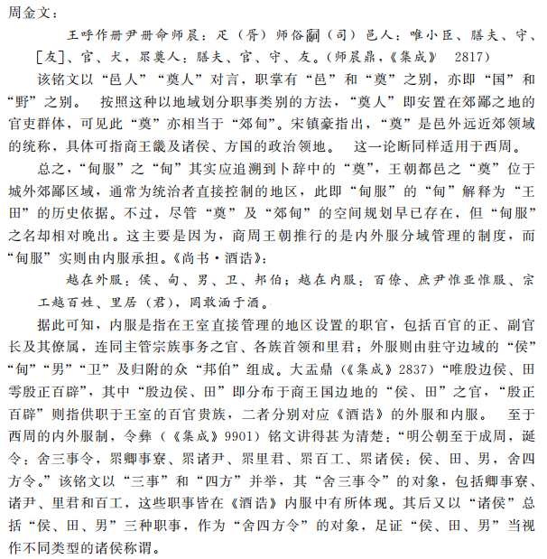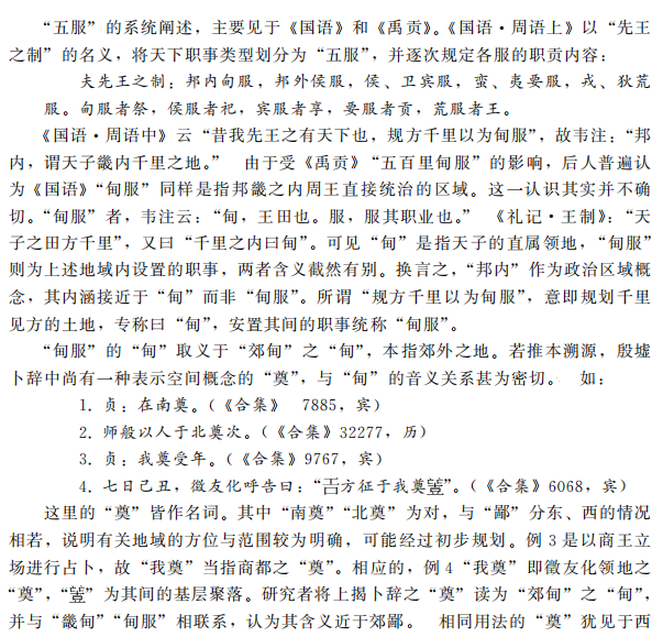 近世以降,考虑到畿服的规划过于齐整,学术界普遍视其为晚出之作。如郭沫若尝言:“畿服之制乃后人所伪托。金文无畿字,服字多见,与《酒诰》义同,并非地域之区划也。”只是针对服制的年代层次,诸家的认识不尽一致。顾颉刚、胡厚宣均主张《国语》“甸”“侯”二服本乎史实,其余各服多为后世析出。徐中舒、唐嘉弘则认为,《国语》“五服”反映了春秋战国之际的观念,而《禹贡》“五服”和《周礼》“九服”是对古史理想化和规范化的成果。当然,即便是经过后人整理形成的畿服学说,其中也会存在较早的史实依据,近年陆续有学者结合出土文献和考古资料进行探索,并就服制的产生背景提出新见。至于“五服”和“九服”的关系,人们通常认为二者属于同类型畿服的扩展,区别主要在于服名的调整和幅员的盈缩。也有研究者注意到不同服制构成要素的内质差异,如赵伯雄认为,《周礼》对“甸服”的安排要较《国语》合理。裘锡圭进一步提出,诸侯称号的“侯”“甸”“男”之“甸”源于商代田官,有别于《国语》和《禹贡》“甸服”之“甸”,后者的语源则是古文字资料中的“奠”。