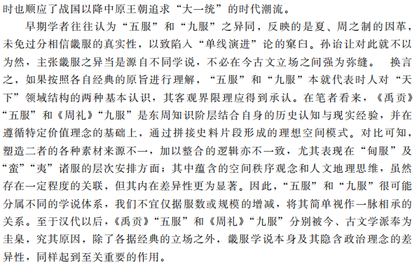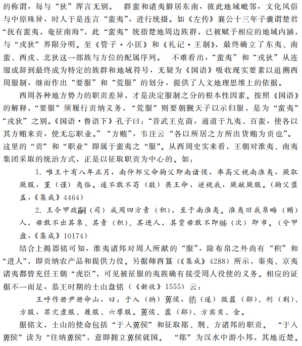 服制是先秦重要的政治制度,也是考察商周国家形态、社会结构诸层面须面对的关键问题。所谓“服”,本义为服从、服事,引申指统治者分派各级贵族承担职事及相应的义务,亦即职贡。一旦职贡的划分通过地域对应性体现出来,便奠定了服制的基础。众所周知,殷商西周时期已经形成较为完备的内外服制,内服和外服之分,不仅反映出王朝地方管理体制的差异性,同时也是统治者实践政治地理构想的产物。文献关于畿服的记载,按服数不同尚有“三服”“五服”“六服”和“九服”之别,甚为复杂,但影响深远者莫过于“五服”和“九服”。鉴于夏商周三代的特殊历史地位,经典文本中的畿服长期被视作政治典范,这种由中心到四方递变的圈层结构,成为古代国家理想的空间秩序,备受后世推崇乃至效法。