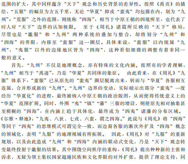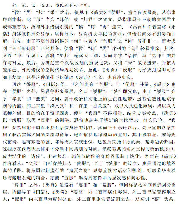 纵观先秦畿服的演变脉络,其核心问题不仅在于追溯商周服制是如何起源并逐步发展的,也包括东周以后服制又是如何被不断重构乃至复现的,因而并不局限于“由真化幻”的单一路径。毕竟,作为制度设计的畿服,既是现实世界的反馈与升华,又是统治思想的提炼与实践。正如《禹贡》和《周礼》的畿服规划,普遍呈现从中心到四方等距离扩展的景观,根本上改变了《国语》“五服”结构的不平衡性。尤其是《禹贡》开始格外强调“夷夏之防”,并通过“绥服”的创设,专门在“华夏”外围增补缓冲圈层,将“四夷”排斥到边缘地带。这种空间规划虽然带有空想色彩,却有助于弥补西周政治地理结构的缺陷,就内在逻辑和思想动因考虑,也许正是汲取了宗周覆亡的经验教训。