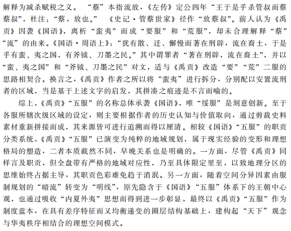 摘 要:畿服之“服”,本义为服事,引申有职贡之义,后演变为政治区域的名称。《国语》“五服”是在商周内外服格局的基础上,逐次增益史实而扩充形成的服制系统,划分各服的依据是以职贡分类为主而兼顾空间分异,其中反映出西周政治地理结构具有不平衡性,对王朝兴衰产生重要影响。《禹贡》“五服”和《周礼》“九服”的文本与现实素材并不一致,对各服的层次安排也体现出相异的史实基础和人文地理思维。二者均为典型的圈层结构,呈现的均衡递变特征与“内夏外夷”观念为后世的政治实践提供了文本依据和思想指南。畿服经历从史实升华为理想蓝图又重返现实层面的循环演进,正是中华文明具有突出连续性的客观写照。