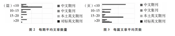 从每期平均文章数量来看(见图2),本土中文期刊每期平均文章数最高,主要集中在10—15篇之间,共有18本期刊,占比最高,其次是15—20篇(11本)和少于10篇(10本),而平均文章数在20—25篇的有7本,超过25篇的仅有4本。中文集刊的文章数量相对集中,少于10篇的占比最高(4本,占57.1%),其次是10—15篇(3本,占42.9%)。本土英文期刊中,大部分期刊每期刊登文章都少于10篇(12本,占92.3%);仅有1本期刊例外,其每期文章位于10—15篇之间。而对标英文期刊以每期少于10篇的为主(40本,占72.7%),其次是10—15篇(10本,占18.2%),而15—20篇之间的期刊仅有3本,超过25篇的只有2本。整体来看,本土中文期刊每期平均文章数普遍高于中文集刊、本土英文期刊和对标英文期刊,中文集刊和英文期刊则以少于10篇的期刊为主。