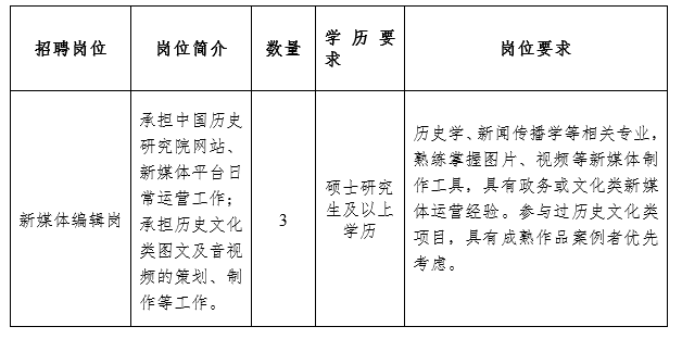 中国历史研究院于2019年1月成立,承担统筹指导全国历史研究工作,整合资源和力量制定新时代中国历史研究规划,组织实施国家重大项目,讲好中国历史、传播中国文化等职责。现根据工作需要,面向社会公开招聘非事业编制人员3名,具体事项如下: