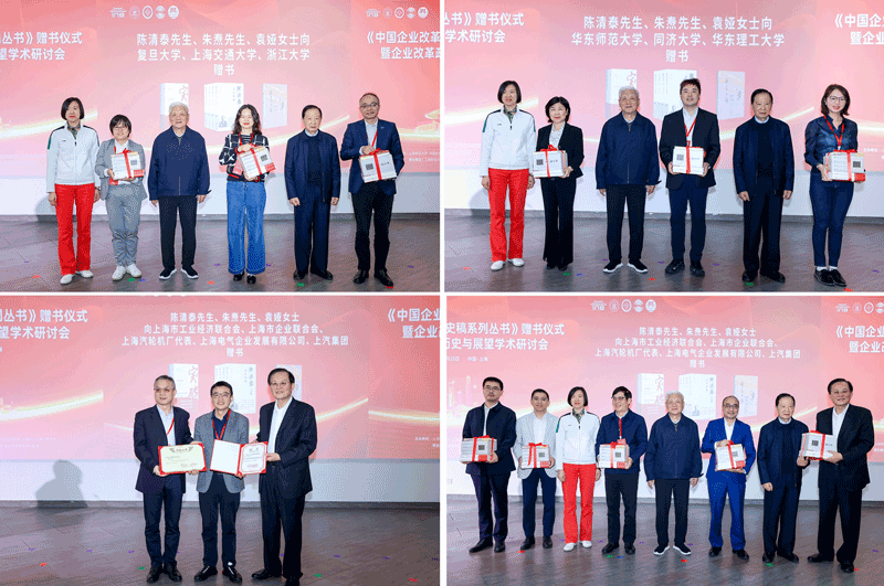 刘元春代表上海财经大学接受赠书并回赠证书。复旦大学、上海交通大学、浙江大学、同济大学、华东师范大学、华东理工大学、上海外国语大学、上海大学、中欧国际工商学院9所院校接受赠书。上海市工业经济联合会、上海市企业联合会、上海汽轮机厂、上海电气企业发展有限公司、上汽集团等接受赠书。靳玉英与缪荣分别代表上海财经大学和中国企业管理科学基金会共同签署合作备忘录。此次捐赠的著作包括《陈清泰文集(1—4卷)》(作者陈清泰)、《由是之路——我经历的五十年企业变革》(作者朱焘)和《突破——中国企业改革政策史稿(1978—2003)》(上下册、作者袁宝华)等。
