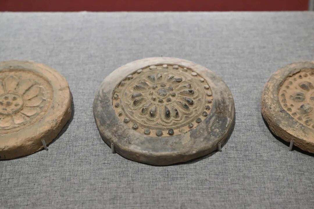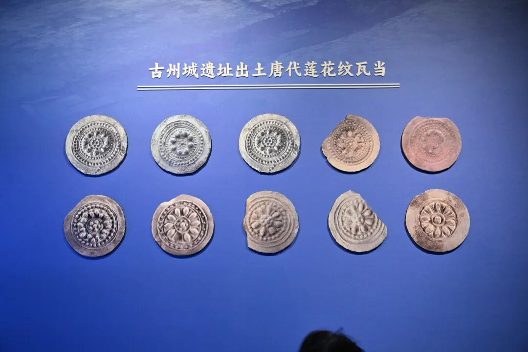 最直观体现这一点的还是建筑。古州城考古现场中发现的众多建筑构件中有不少莲花纹瓦当,唐代的莲花纹瓦当具有三个特点,一是中间的莲蓬,二是外圈的花瓣,三是最外圈的连珠纹。古州城遗址出土的莲花纹瓦当兼具上述特点,又有自己的风格。古州城遗址出现的瓦当最外圈有两层连珠纹。据推测,这样的设计可能是因为古州城距离长安很远,对于当时的工匠而言有较高的设计自由度,所以才会出现这种创新的纹样。而展出的长安城遗址瓦当中,也有自己的特点,比如两片花瓣组成的重瓣莲花纹瓦当,就是盛唐气韵的表达。