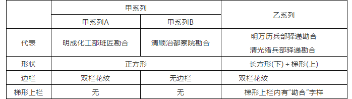 与此相关,勘合不仅因使用目的彼此互异,在形制上也各有特点。前述明成化工部班匠勘合不仅与明洪武户帖十分相似,也非常接近清代顺治年间都察院勘合,但又各有特点。以下简称“甲系列”。另一方面,同样是用于驿递的明万历兵部驿递勘合和清光绪兵部驿递勘合则十分相似。以下简称“乙系列”。两系列在官印、半印字号、发行根据以及相关戳记等方面有很多共同点,至于外观方面则各有不同,兹撮取两系列在形制上的要点,汇为下表。