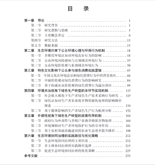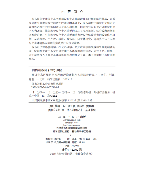 由江苏省重点培育智库江南大学食品安全风险治理研究院副院长王建华教授带领研究团队,历时五年著成的《推进生态环境协同治理的理论逻辑与实践路径研究》一书,重点关注公众的亲环境行为,试图厘清公众参与生态环境协同治理的行为逻辑,探究协同治理下的生态环境政策机制与生态效率提升路径,以期推动公众形成环境友好的消费模式与生产方式,为促进生态文明建设、推进生态环境协同治理、实现可持续发展提供理论基础与政策支持。该书共六个章节,具体从公众环境心理与环保行为机制、公众参与绿色消费实践逻辑、绿色生产转型多环节实现机制、绿色生产转型政策作用机制和生态环境协同治理的实践路径与优化策略等方面,充分结合宏观统计数据和微观调研数据,使用宏观统计数据探究不同经济发展水平下公众生态环境保护的行为逻辑与实践机制,使用微观调研数据分析公众采纳公私领域亲环境行为的影响因素,明确了消费和生产环节在生态环境协同治理中的重要作用,明晰了政策规制等政府行为对公众环境保护行为的影响程度和作用机制,从不同视角反映和准确描述了近年来我国政府、公众(生产者和消费者)、媒体等多主体在良性的市场环境下通过协商合作,共同承担治理生态环境、提供绿色生态产品和服务、完善绿色农产品价格机制的责任,实现生态环境协同治理的全景。