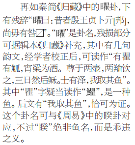 ”。此卦名在《周易》中作“谦”,“陵”与“谦”恐怕不是通假。在古文献中,“陵”字有上升义,如枚乘《七发》“陵赤岸”,刘良注:“陵,上也。”《后汉书·周黄徐姜申屠传赞》“陵阿穷退”,李贤注:“陵,升也。”残辞中的“为木出焉”是指树木从水中升起,正是用“陵”字的上升义。在《周易·谦》中,谦是谦虚、谦让义,与秦简《归藏》显然不同。