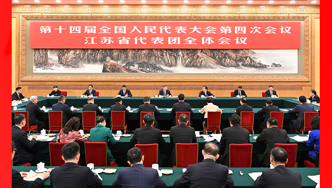 3月5日下午,中共中央总书记、国家主席、中央军委主席习近平参加他所在的十四届全国人大四次会议江苏代表团审议。