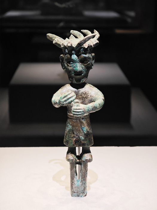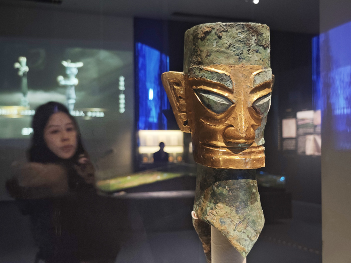 三星堆博物馆藏戴冠纵目面具与中国国家博物馆藏戴冠纵目面具在本次展览中并列展出,这是自1986年三星堆祭祀坑发掘以来,这两件标志性青铜面具的首次同台亮相。