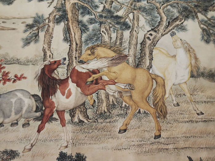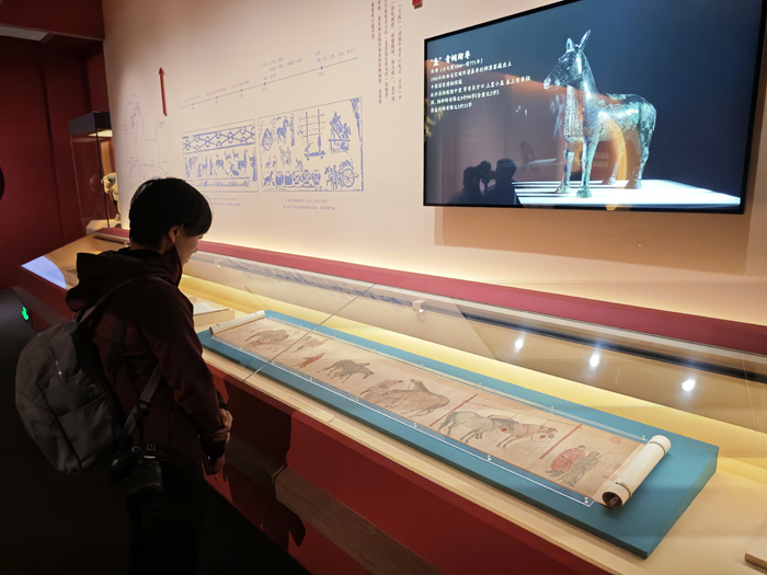 展品中,唐代的“三彩黑釉陶马”除面、鬃、尾、蹄涂白釉外,全身披黑釉,在唐三彩中实属罕见,而且造型雄健,釉色匀称,姿态自然,是唐三彩马中不可多得的精品。西汉的“木胎漆马”通体髹以黑漆,眼、耳、口、鼻处施有朱漆,马肌体雄健,神采奕奕,具有明显地域特征。清代的《十八骏图卷》骏马腾跃顾盼,造型准确,动态强烈,毛发描摹细腻,整体有明暗,富于立体感。