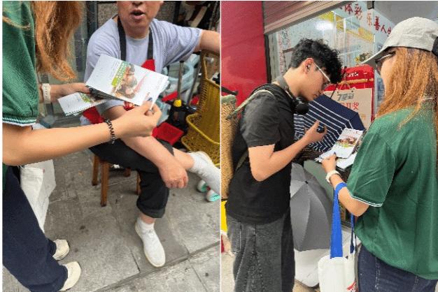 首站抵达金川县,先锋团成员带着推普宣传手册走上街头,向过往村民介绍活动内容,同时了解当地人的普通话使用习惯。成员们边询问边记录,重点关注“一老一少”人群、“n”和“l”的发音混淆以及小学生日常用语语义误用等习惯问题。同时,为增强推普实践的趣味性,团队根据调研结果增设有奖互动环节,给老年人准备了垃圾袋、牙刷、抹布等日用品,给小学生挑选了橡皮、星球杯、贴纸等玩具零食等,满足不同群体需求,为接下来的互动埋下温馨趣味的伏笔。