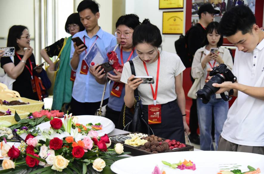 在烹饪一体化实训室,早已摆满了学员们精心制作的作品。中式、西式、冷拼、糕点,看得记者们垂涎欲滴,早已有忍不住的记者在试吃区忙活起来,“这个好吃,快来尝尝”“这个糕点是用什么做的?”“能带走几块吗?”现场好不热闹。