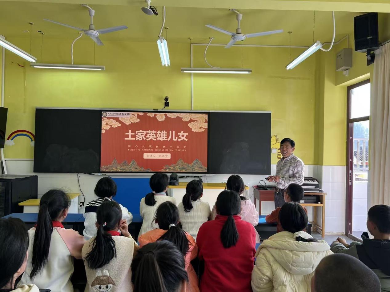 随后,刘礼堂以“土家英雄儿女”为主题,为恩施白果树小学的同学们带来了一堂红色文化课。从盘瓠传说、马援南征、张飞镇守阆中,到土家将士抗倭卫国、土家儿女投身革命与抗战的英雄事迹,他娓娓道来。刘礼堂表示,土家英雄儿女的每一次奋起、每一次牺牲,都生动诠释了“我们辽阔的疆域是各民族共同开拓的,我们悠久的历史是各民族共同书写的,我们灿烂的文化是各民族共同创造的,我们伟大的精神是各民族共同培育的”这一深刻道理,各民族在历史长河中早已结成血肉相连、生死相依的命运整体,重温这段历史,就是要从中汲取团结奋进的力量,让跨越山河的民族情谊与家国大义,继续照亮中华民族共同前行的道路。刘礼堂勉励同学们从小树立家国情怀,努力学习,将来为家乡发展和民族复兴贡献力量。