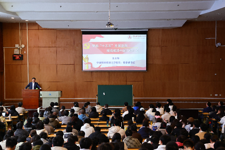 课程首讲由中南财经政法大学校长、党委副书记朱方伟讲授。时值全国两会,朱方伟以“同学们是否收看了政府工作报告”的提问切入,将课堂与时代的脉搏紧紧相连。他从“十四五”的辉煌成就讲起,用跨越140万亿元的经济总量、增长近50%的研发经费等鲜活数据,夯实了发展的底气;继而转向“十五五”的宏伟蓝图,深入剖析其作为现代化建设关键阶段的承前启后意义,详解“六个坚持”原则与七大发展目标。他将“科技自立自强”“共同富裕”等国家战略任务,与青年学子的专业选择、生涯规划巧妙关联,并寄语每位同学制定“个人五年规划”,实现国家蓝图与个人理想的“同频共振”。