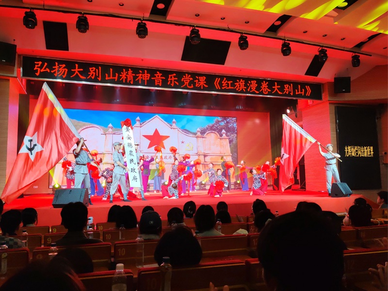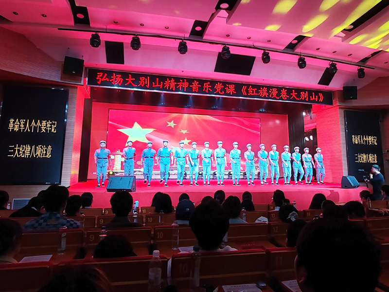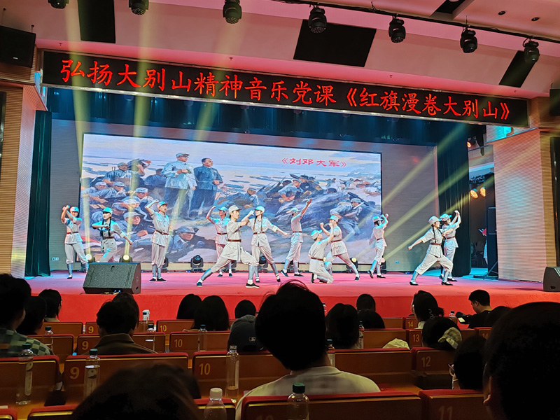 音乐党课以“红旗漫卷大别山”为主题,以音乐为纽带、历史为根基,通过《董必武回黄安》《八月桂花遍地开》《三大纪律八项注意》等九首经典歌曲串联1921年至1949年大别山地区新民主主义革命历程。以理论讲解、歌舞表演、现场问答等多种形式,引导观众沉浸式感受大别山波澜壮阔的革命历史。本次音乐党课在保留传统节目的同时,深度挖掘武大红色基因,展示了董必武、陈潭秋等革命先驱与武大的红色渊源,董必武为武大题词等相关历史内容。演出的最后,全体观众起立,齐唱《唱支山歌给党听》,激昂的旋律久久回荡,大别山精神的种子在青年学子心中扎根发芽。