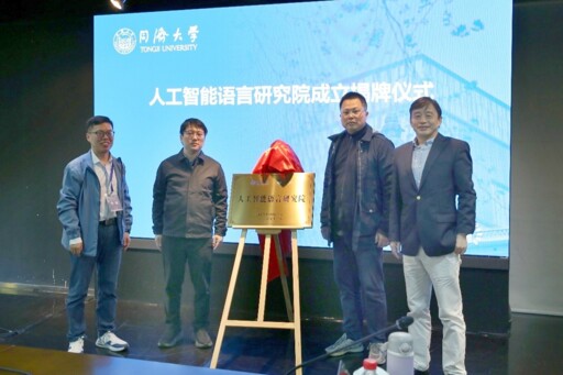 活动中,周鸣浩、沈骑、同济大学外国语学院教授孙坤、同济大学外国语学院教授许文胜共同为同济大学人工智能语言研究院揭牌。