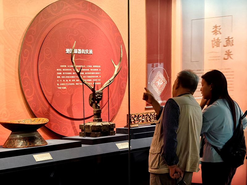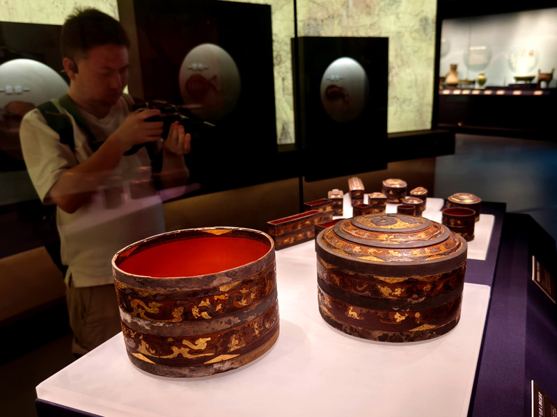 展览现场展出的“银釦金银箔贴饰云气鸟兽人物纹漆奁” 本网记者 李超/摄