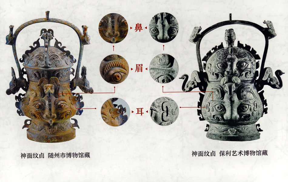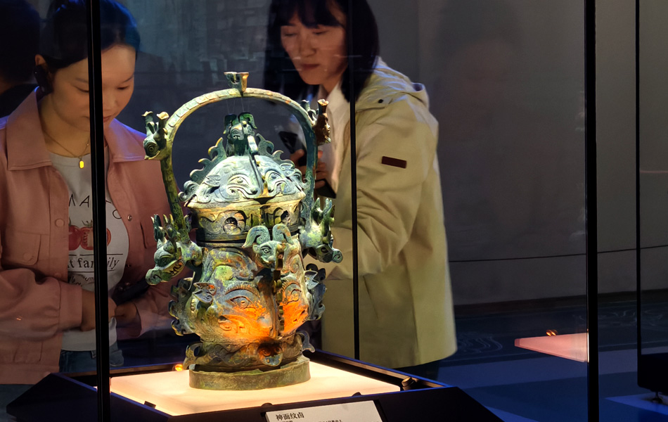 在展览现场,众多精美的鄂国青铜器吸引了观众的目光。这些青铜器上装饰着几何纹、兽面纹、龙纹等丰富纹样,既显庄严厚重,又充满艺术活力。其中,神面纹卣、神面纹尊和神面纹方罍尤为引人注目。