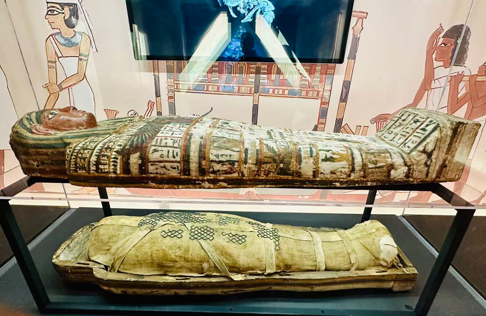记者在开幕现场了解到,本次展览呈现的180件/套古埃及文物中有167件/套、近95%为首次在亚洲展出。据广州市凡拓数字创意科技股份有限公司策划总监潘晓聪介绍,此次展览中,三套完整的木乃伊及棺椁尤为珍贵,涵盖成年女性和儿童等不同年龄段。除了木乃伊猫,还有木乃伊鳄鱼,它们共同反映了古埃及人的神权信仰和动物崇拜。