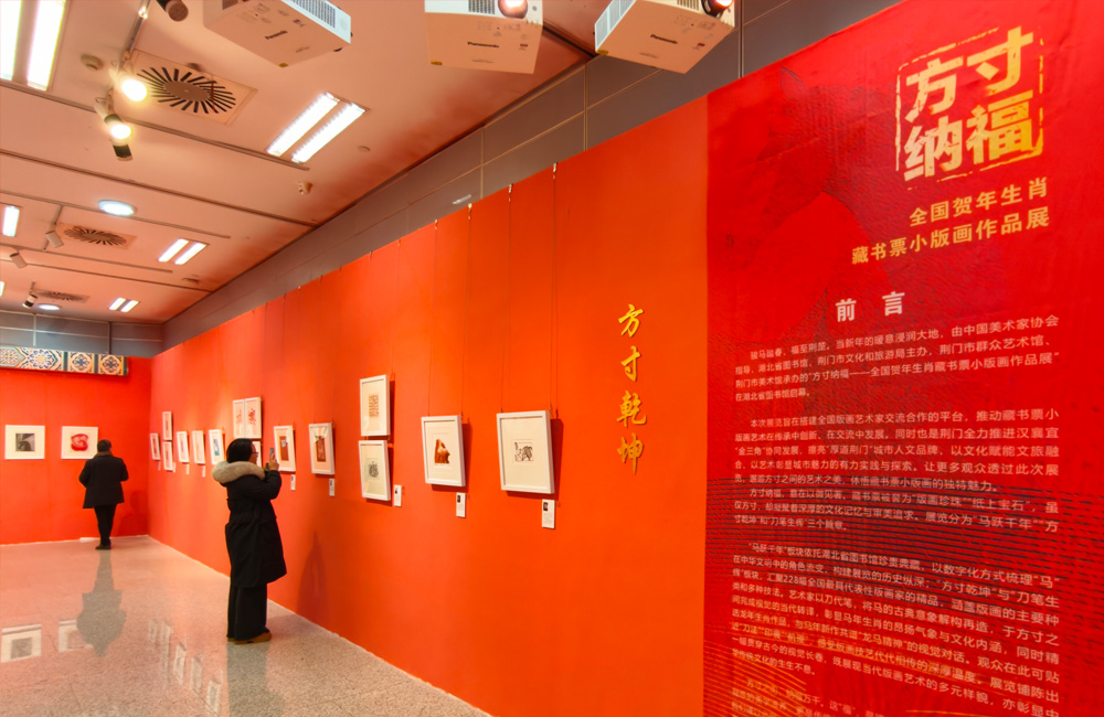 中国社会科学网讯(记者 李超)骏马踏春,福满荆楚。2月22日,记者走进湖北省图书馆,“方寸纳福——全国贺年生肖藏书票小版画作品展”正在展出。本次展览由中国美术家协会指导,湖北省图书馆、荆门市文化和旅游局联合主办,荆门市群众艺术馆、荆门市美术馆具体承办。