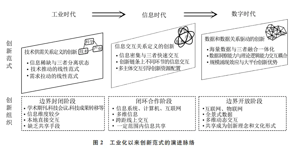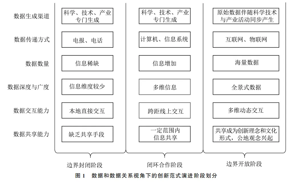 进入21世纪,以互联网、大数据、人工智能为代表的数字技术带来数据生成、传递和处理能力的极大提升,数据关系重新定义创新链条上各方的交互方式和地位作用,创新要素、创新主体、创新过程和创新组织等方面发生重要改变,这些改变导致数字时代的创新范式呈现出数据和数据关系驱动的新形态。