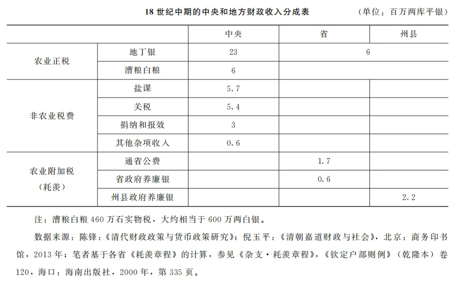 有学者利用改革在各省渐次展开的特点,通过1710—1760年的府级数据发现,改革提高了严重灾害时的赈灾频率,且改革效应在洪灾时更大、在征税困难的地区更大,说明了这一改革在时间和空间维度上集中了更多资源,增强了省级政府应对灾害风险的能力。随着耗羡归公的完成,清代的政府间建立了一种“准财政分权制”:各级政府在农业税上建立了固定总额和固定比例的分成。一方面,中央享有超过八成的正式农业税(约合2900万两),而对于600万两的正项存留银,地方政府并无自主收益权,只能按户部的经制规定用于承担各种地方的固定开支项目的支出责任(官员俸禄、驻军军饷和驿站等);但地方政府对440万两的农业附加税收入的使用则有较高的自主性。另一方面,中央政府仍然掌握绝大部分的非农业税收入,其中包括捐纳报效等临时性收入用于紧急开支(见下表)。