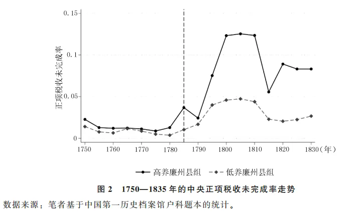 笔者利用户科题本档案中关于各地税额亏空未完的记录,构建1750—1835年间县级正项税征收的数据库,并采用双重差分法,以各县养廉银数额的差异度量政策冲击程度,实证检验了1785年上收养廉政策对财政能力的影响。按照养廉银数额的中位数,可将所有州县分为受到冲击高和冲击低两组(见图2)。