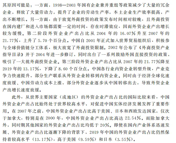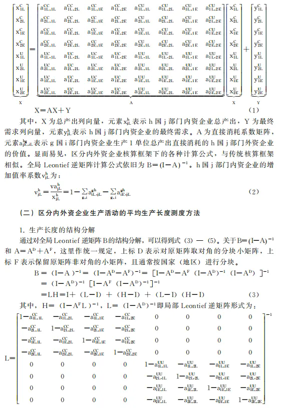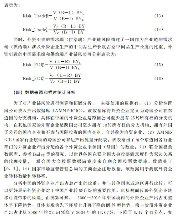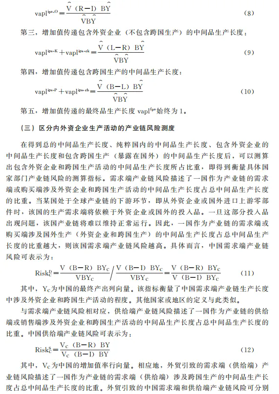 随着全球生产链长度、位置与跨境次数等指标测度方法的完善,一些学者开始使用生产长度测度产业链风险。例如,倪红福等基于生产长度的测算方法,将风险敞口定义为外部中间品生产长度占总中间品生产长度的比重,同时考察了产业链风险收益比。但这一测度框架没有对内外资企业的生产活动进行区分,一定程度上低估了中国产业链风险。总而言之,现有文献主要对增加值核算和总值核算的测度指标进行改进,但未能对本国的内外资企业生产活动进行区分,忽略了外资企业生产活动可能带来的影响,也就无法准确度量和解析一国产业链风险。