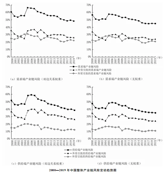 第一,传统测算方法明显低估了制造业产业链风险。2019年中国制造业需求端产业链风险为51.45%,而传统测算方法得到的风险仅为23.43%,低估了28.02个百分点,低估值甚至高于当年的外贸风险。第二,传统测算方法低估了中国各部门需求端产业链风险的变化程度,且各部门需求端产业链风险的下降主要源于外资风险下降。中国制造业需求端产业链风险从2000年的59.14%降至2019年的51.45%,下降了7.69个百分点。其中,外资引致的风险从2000年的34.94%降至2019年的28.02%,下降了6.92个百分点;而外贸引致的风险从2000年的24.20%降至2019年的23.43%,仅下降了0.77个百分点。外资引致的风险下降对制造业需求端产业链风险下降的贡献度为89.99%,显著高于外贸引致的贡献度(10.01%)。第三,使用进口贸易依存度将高估外贸引致的制造业产业链风险。在此期间,制造业进口贸易依存度水平处于[25.78%,52.53%],而外贸引致的需求端产业链风险处于[21.39%,31.69%]。由于进口贸易依存度指标的分子为进口总值,而分母却是增加值(GDP),存在分子和分母度量口径不一致的问题,可能高估一些部门外贸引致的产业链风险。可见,基于生产长度构建的产业链风险指标可以有效解决度量口径不一致的问题。