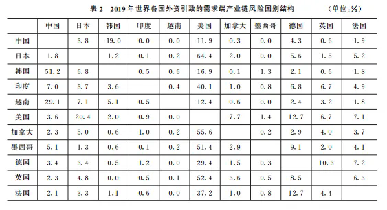 对一国产业链风险的国别结构进行分析,有助于识别产业链面临的潜在风险。外资引致的需求端产业链风险份额是指在各国需求端产业链生产长度中,暴露在来自某一国家的外资企业的中间品生产长度占本国境内所有外资企业中间品生产长度的比重(以下简称“外资风险份额”)。如表2所示,中国(行)与美国(列)单元格中的11.9,表示中国在产品生产过程中暴露在母国为美国的外资企业的后向生产长度占中国境内所有外资企业的总后向生产长度的比重为11.9%。