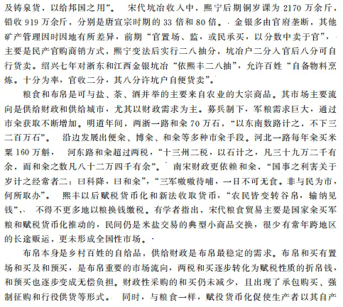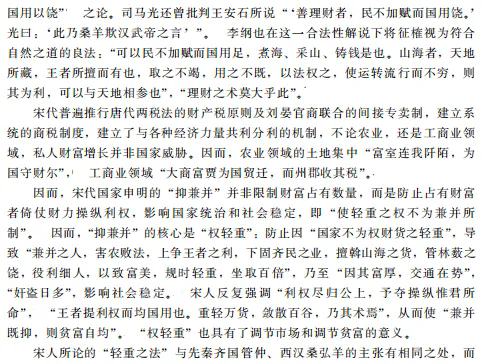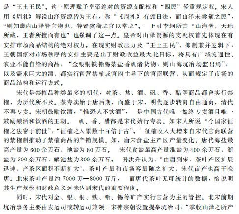 宋代仍在“王土王民”原理,以及“崇本抑末”“抑兼并”“权轻重”的逻辑下坚持传统农商观念,解说工商业政策的合法性,从而使工商业收入得以“合法”增长。在这一原理和逻辑下,皇帝对山海资源和“四民”轻重有绝对支配权,有权在财政收益最大化目标下安排市场商品结构,将几乎所有具有广域流通性、农业不能自给的重要商品实行官营禁榷,财政收支广泛使用市场化手段,造就了规模空前的财政性市场,并在商品结构和远距离贸易中相对于自发性市场占据了主导地位。